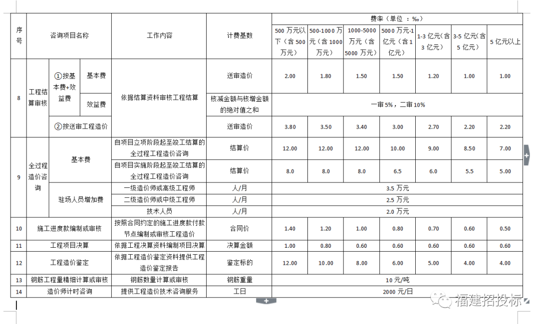 福建省建设工程造价咨询服务费行业标准